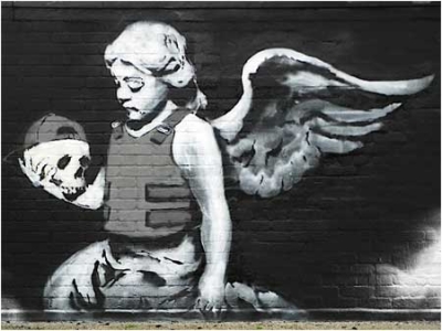 Banksy Angel in Bulletproof Vest (Fallen Angel) Graffiti - London, UK